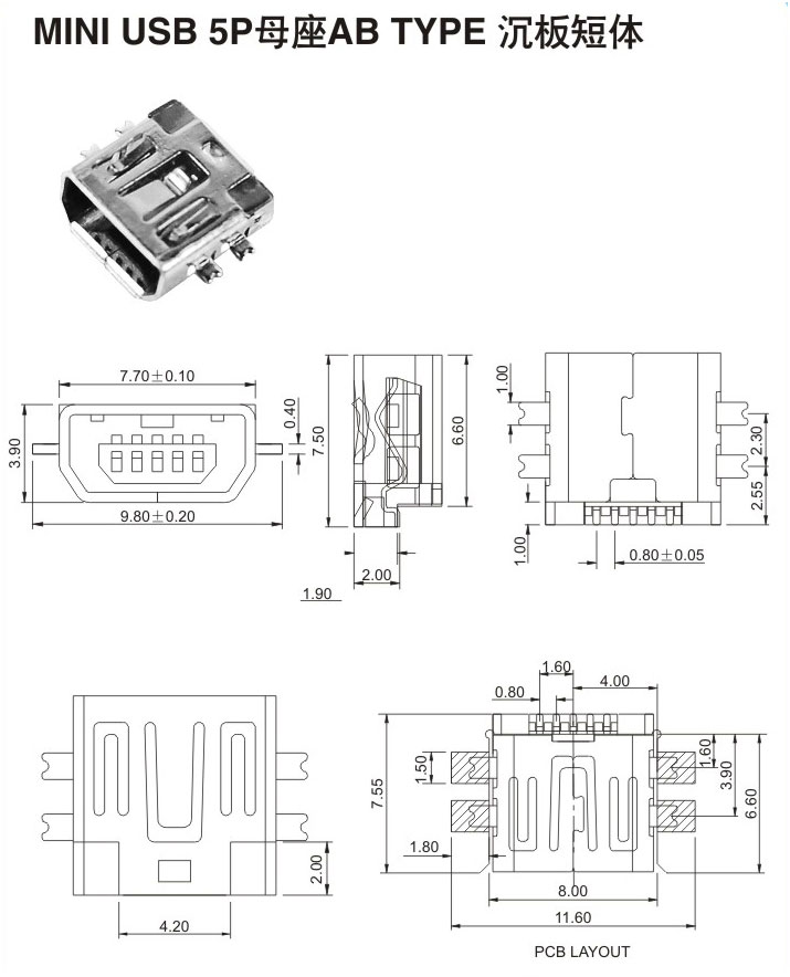 MIMI USB 5P母座 AB Type 沉板短體
