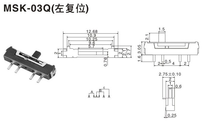 小撥動開關MSK-03Q (左復位).產品廣泛應用于計算機周邊、多媒體音響、家電儀器、電子玩具、視聽設備、通訊設備等。
