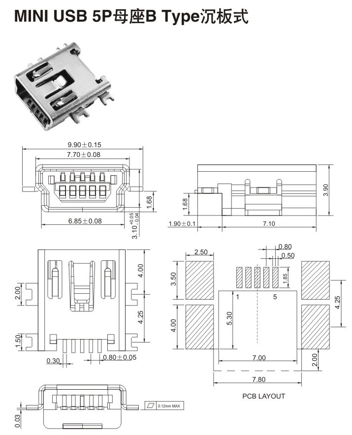 MIMI USB 5P母座 B Type 沉板式